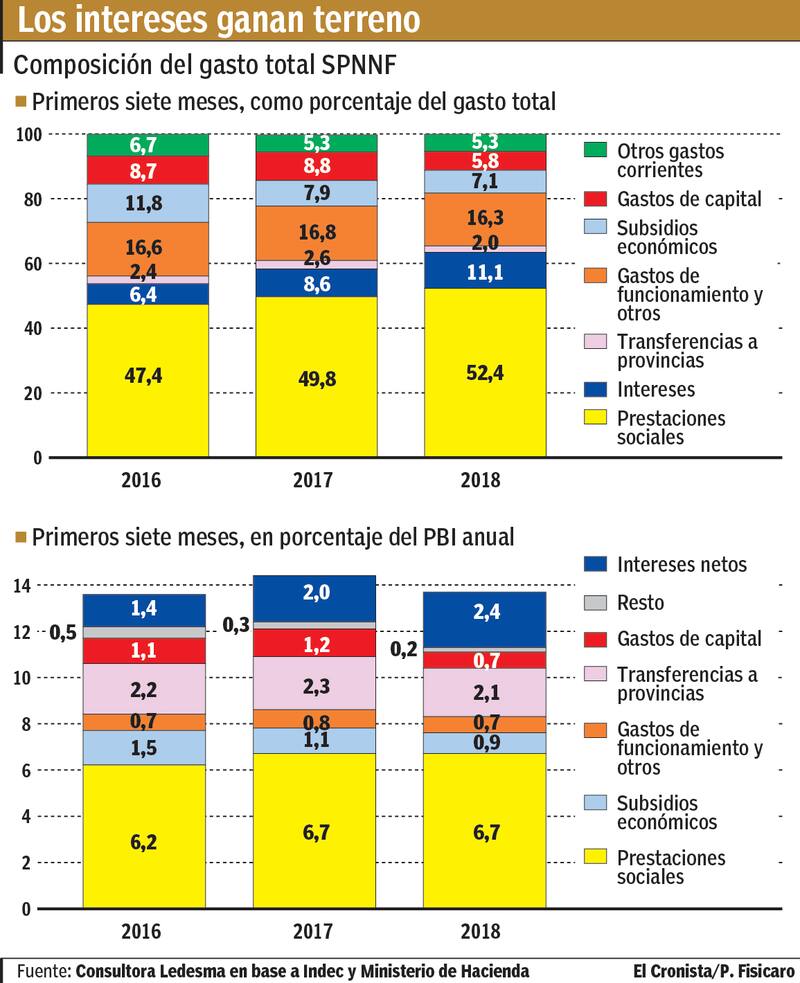 En términos del PBI, los intereses pesan 2,4% este año, detrás de las prestaciones sociales (6,7%), pero por delante del gasto de funcionamiento (2,1%), del gasto en capital (0,7%) y de las transferencias a provincias (0,3%), según datos de la consultora Ledesma. En 2017, los intereses pesaban 2% del PBI, por debajo del gasto operativo (2,3%).