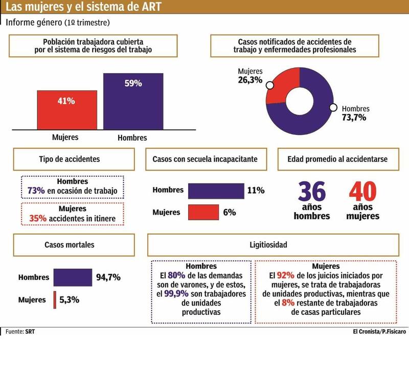 Pese a que representan más del 40% de la masa laboral del sector formal de la economía, las mujeres protagonizan apenas uno de cuatro accidentes en ocasión de trabajo e involucran poco más del 5% de los casos mortales en relación con la población de varones. Además, en el análisis del escenario de creciente litigiosidad que enfrenta el régimen de riesgos del trabajo (ART) sobresale el hecho de que solo el 20% de los juicios contra el sistema son iniciados por trabajadoras mujeres, contra el 80% de las demandas formuladas por el personal masculino.