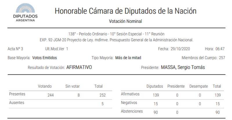 La Cámara de Diputados aprobó por 139 contra 15 votos y 90 abstenciones de Juntos por el Cambio el proyecto de Presupuesto 2021 que tiene como ejes centrales el aumento de gastos de capital para realizar un plan de obras públicas y una fuerte reducción del pago de los intereses de la deuda a partir del éxito obtenido en el proceso de reestructuración.