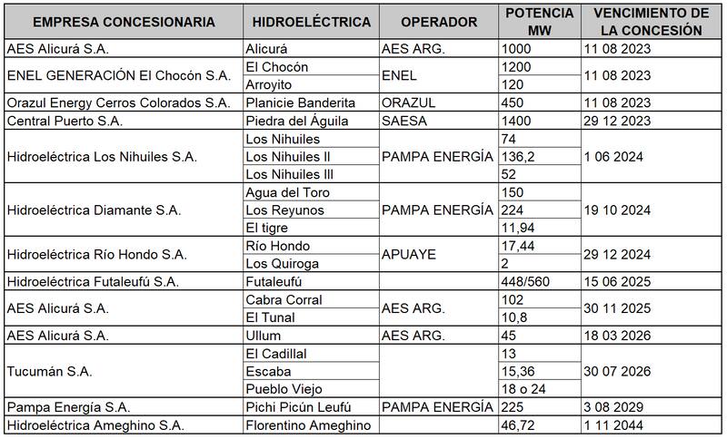 A través de la Resolución 130/2022, la Secretaría de Energía que conduce Darío Martínez formalizó la integración de un equipo de trabajo para elevar análisis técnicos y financieros de las concesiones Alicurá (de la multinacional estadounidense AES), El Chocón, Arroyito (de la italiana Enel), Planicie Banderita (de la estadounidense Orazul Energy) y Piedra del Águila (Central Puerto), que vencen entre agosto y diciembre de 2023.