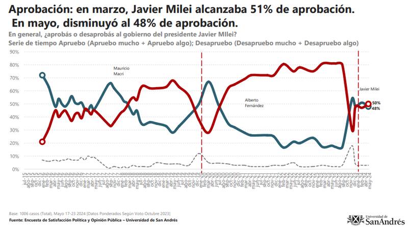 Una nueva encuesta sobre satisfacción política realizada por la Universidad de San Andrés (UdeSA) a la que accedió El Cronista muestra que el 50% de los consultados desaprueba la gestión del gobiernode Javier Milei,a casi seis meses de su asunción. Mientras que el 48% lo aprueba.