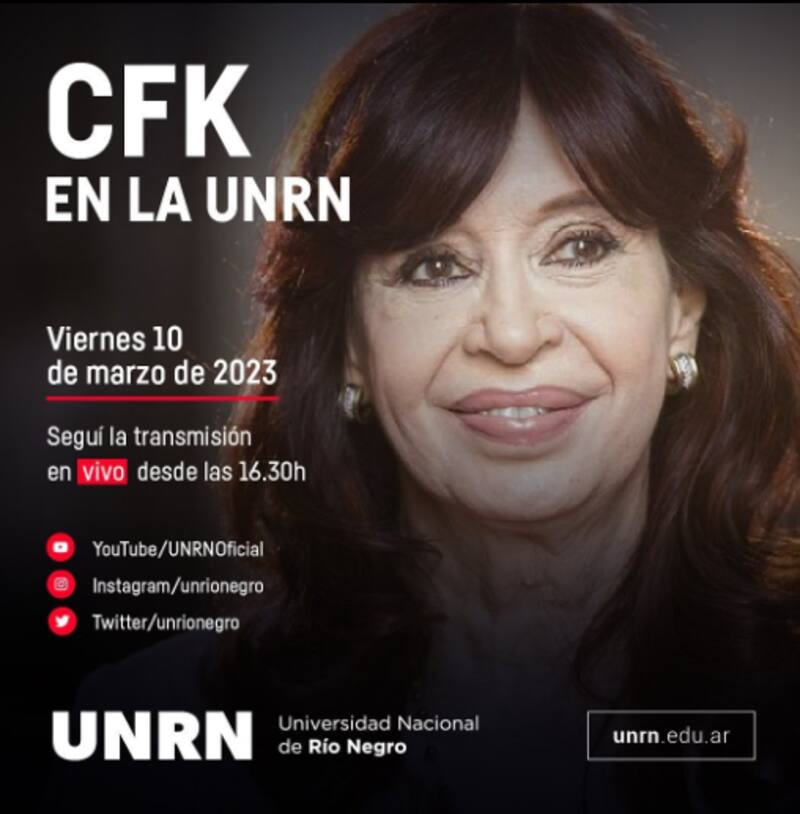 La vicepresidenta Cristina Fernández de Kirchner recibirá este viernes 10 de marzo el Doctorado Honoris Causa de la Universidad Nacional de Río Negro (UNRN).