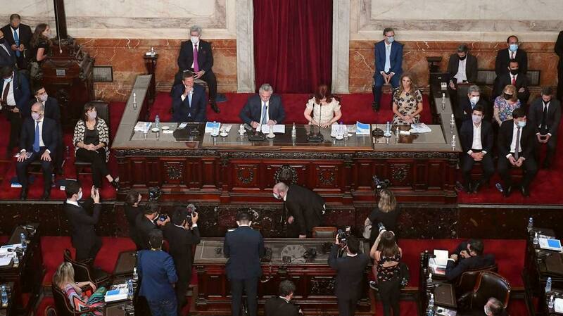 El recinto estará colmado y se espera que tanto opositores como oficialistas reaccionen a las palabras del Presidente. La imagen mostrará a su derecha a Cecilia Moreau, presidenta de la Cámara de Diputados, y en el lado izquierdo, a Cristina Kirchner, máxima autoridad del Senado, entre otro funcionarios de las Cámaras Alta y Baja del Congreso Nacional.