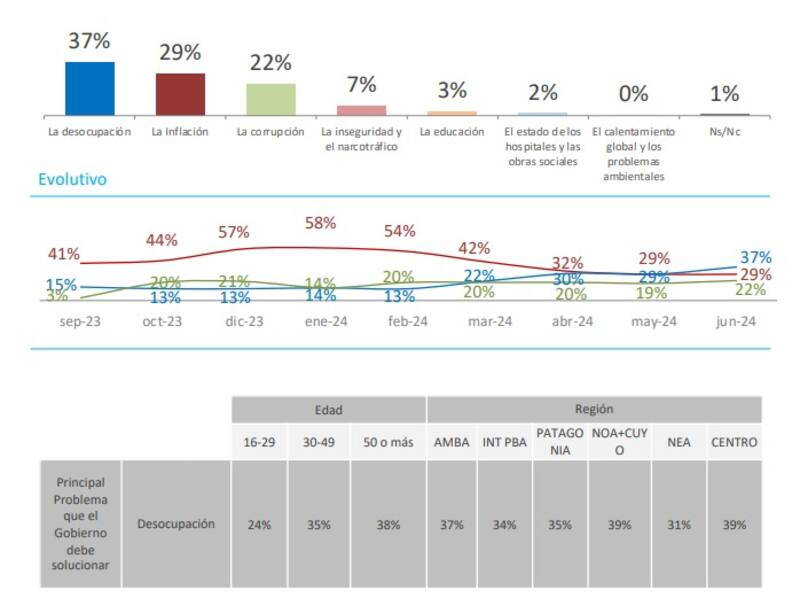 En este sentido, la encuesta determinó que se frenó "la tendencia optimista con respecto al descenso de la inflación y estabilidad del dólar". A la par, uno de los datos más sonados de la encuesta es que por primera vez desde el inicio de los relevamientos, la desocupación se posiciona como el principal problema percibido, relegando a la preocupación por la inflación