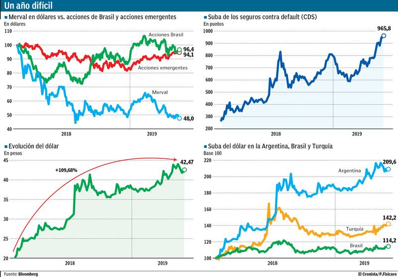 El primer aniversario del inicio de la corrida cambiaria muestra un balance por demás negativo. El dólar subió cerca de 110%, al pasar de $ 20 hasta los $ 42,40 actuales. El riesgo país, por su parte, más que se duplicó, al subir desde los 400 puntos hace un año hasta las 860 unidades mientras que los seguros contra default (CDS) se elevaron 260%, aproximadamente. El impacto negativo se percibió también en la renta variable. Si bien el Merval en pesos aún opera en el mismo nivel que registraba hace un año, medido en dólares registró una brutal caída del 50% en promedio, con acciones que registraron perdidas superiores al 70% en la moneda estadounidense durante el ultimo año. Este panorama también golpeó la imagen del Gobierno, potenciando la incertidumbre electoral.