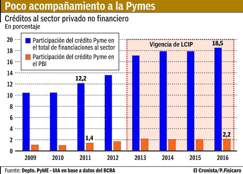 De todas maneras, en el power point presentado ante los industriales de todo el país, los directivos del Departamento Pymi hicieron hincapié en que todavía las pequeñas y medianas empresas siguen estando muy relegadas del sistema crediticio. Según graficaron, la participación del crédito pyme equivale al 2,2% del PBI, mientras que en México alcanza al 8,1%; en Colombia, al 23,3%; en los Estados Unidos, al 40,1% y en Corea, al 104%. A su vez, la incidencia del crédito pyme en el total de financiaciones al sector privado no financiero trepa al 18,5%, según el documento de la UIA.