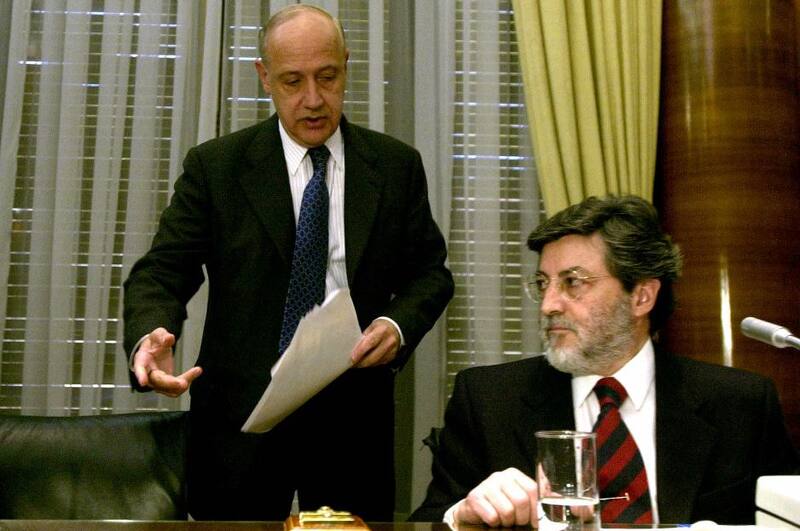 El exministro de Economía Roberto Lavagna, junto a el extitular de la AFIP Alberto Abad , Reunión Conferencia de Prensa (2003).