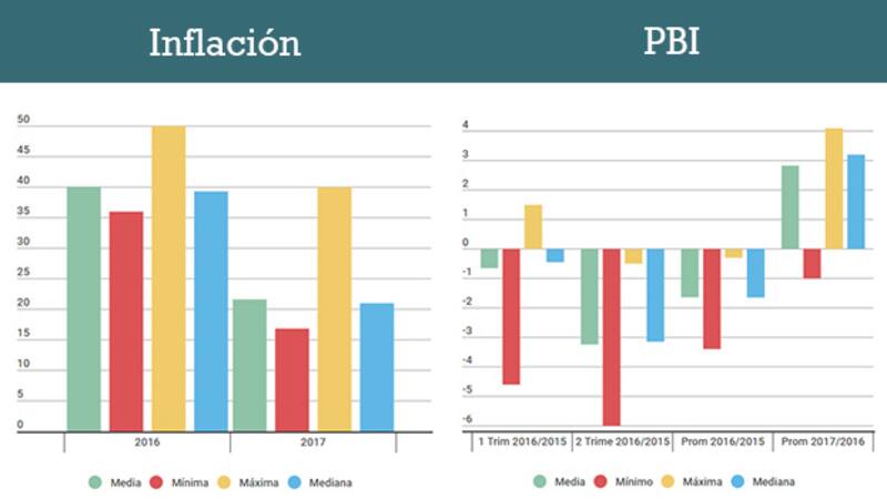 Los principales analistas de la economía argentina prevén en promedio que el 2016 cierre con una inflación del 40,06% y una contracción del Producto Bruto Interno del 1,64%. Sin embargo, y aunque con matices, creen que ese panorama complicado cambiará fuertemente en 2017, para el que hoy anticipan una suba del 21,64% de los precios minoristas y un crecimiento del PBI del 2,83%.
