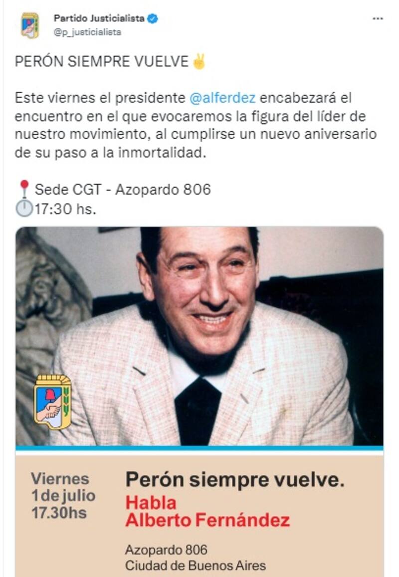 Así lo anunció esta tarde el Partido Justicialista a través de su cuenta de Twitter. "Este viernes el presidente @alferdez encabezará el encuentro en el que evocaremos la figura del líder de nuestro movimiento, al cumplirse un nuevo aniversario de su paso a la inmortalidad", señala el texto.