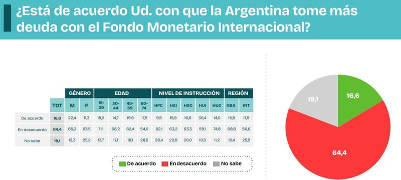 Del total de encuestados, apenas el 16,6% se mostró a favor de que Argentina tome más deuda con el Fondo. En ese contexto, un 64,4% se mostró en desacuerdo con que el país aumente su endeudamiento con el organismo.