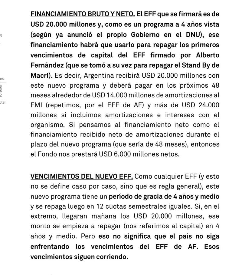 La otra alternativa es que los u$s 20.000 millones sean el monto total del programa. Esto implicaría que el pago de la deuda de 2026-2029 con el FMI está incluido en ese total, por lo que los fondos frescos serían u$s 6000 millones.
