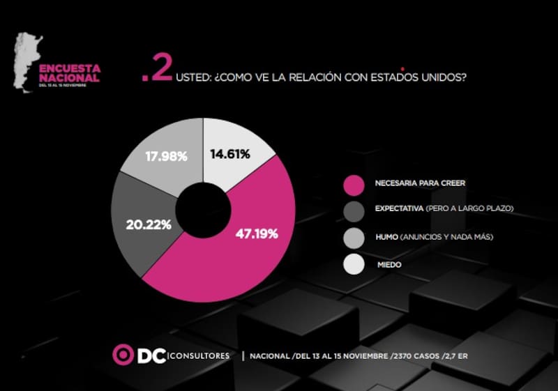 Una reciente encuesta nacional de DC Consultores, a la que tuvo acceso El Cronista, arroja luz sobre la percepción de los argentinos acerca de la relación entre el gobierno libertario y los Estados Unidos.