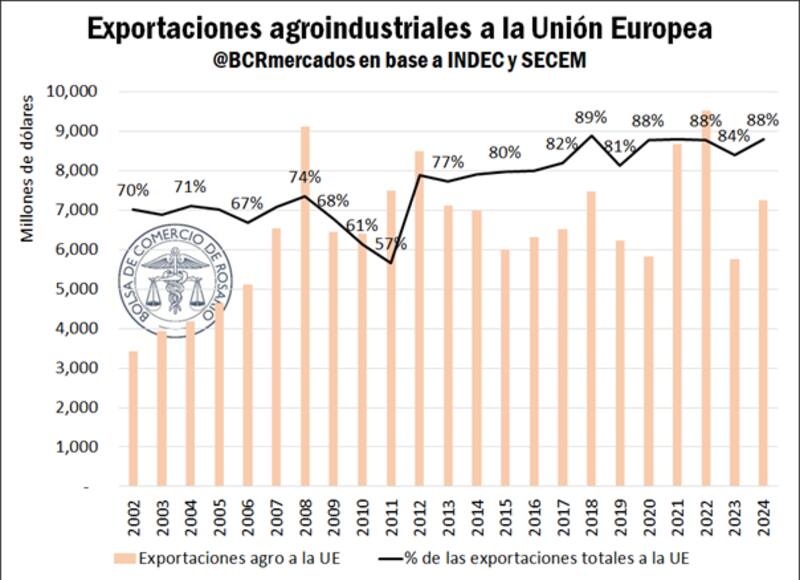 Sobre un total que se ubica entre 8 y 9 mil millones de dólares al año, las exportaciones del sector agroindustrial a la UE dieron un salto de u$s 6000 a casi u$s 9000 millones entre 2020 y 2021; la cifra volvió a caer en 2023 pero superó los u$s 7000 millones en 2024.