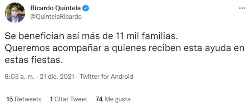 "Se benefician así más de 11 mil familias. Queremos acompañar a quienes reciben esta ayuda en estas fiestas", enfatizó Quintela.