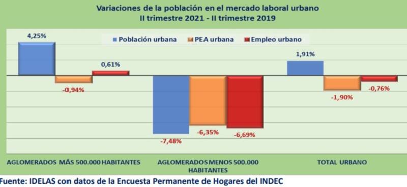 Además "en el bienio se detectó mayor disminución de la población económicamente activa que la caída registrada en el empleo neto total (en blanco y en negro, en relación de dependencia en el ámbito público y privado, como en condición de independiente)", sostiene IDELAS y especifica: " Fueron los casos de los partidos del Gran Buenos Aires; en menor medida en la Ciudad Autónoma de Buenos Aires; Gran La Plata; Mar del Plata; San Nicolás-Villa Constitución; Bahía BlancaCerri; Formosa; y Río Gallegos. Por el contrario, el empleo (demanda) se contrajo más que la caída de la oferta (PEA) en Gran Tucumán; Neuquén; y Rawson-Trelew. La excepción fue Gran Paraná, en Entre Ríos, donde la participación de la población en el mercado de trabajo disminuyó en el bienio considerado en 1.332 personas, no obstante que la Encuesta Permanente de Hogares midió un aumento neto de la ocupación en 3.120 trabajadores".
