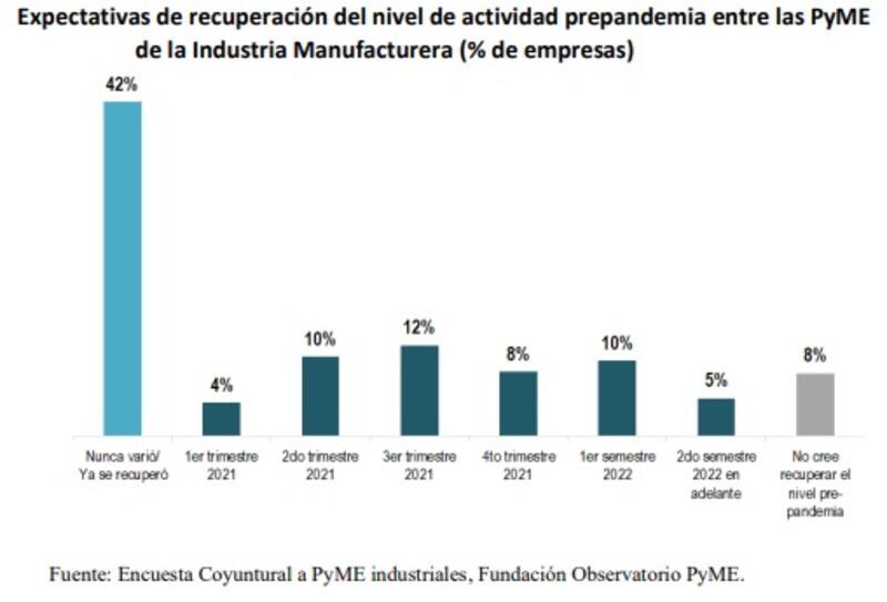 "La expectativa de total 'normalidad' entre las PyME (10-250 ocupados) manufactureras se espera recién para 2022, cuando el último 15% de las empresas del sector recupere su nivel de producción prepandemia", señala la Fundación Observatorio Pyme.