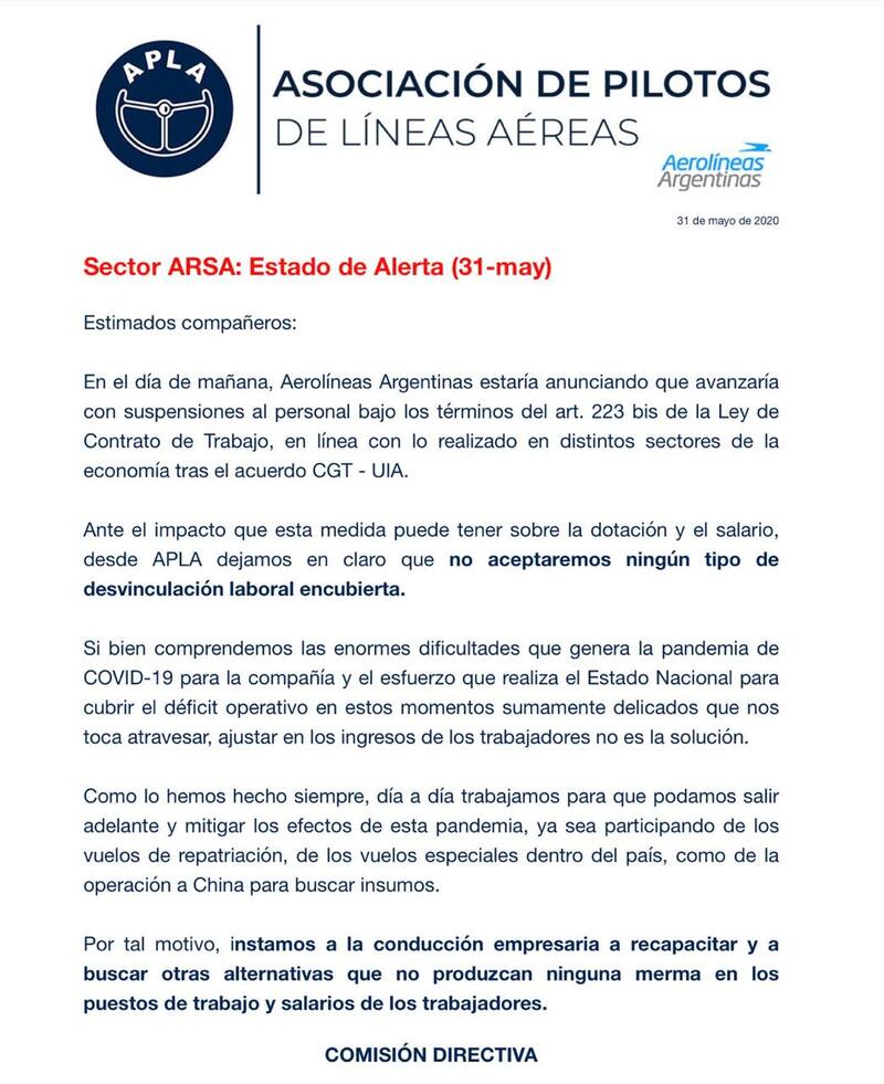 A su vez, desde la Asociación de Personal Técnico Aeronáutico (APTA), la conducción sindical que encabeza Ricardo Cirielli, apuntó que aguardará la comunicación oficial de la empresa sobre el plan de suspenciones, que alcanzaría a unos 8000 trabajadores (en total la firma tiene alrededor de 12.000 empleados) y reclamó que todas las negociaciones por la complicada situación se lleven adelante con la intervención de las autoridades del Ministerio de Trabajo, que lidera Claudio Moroni.