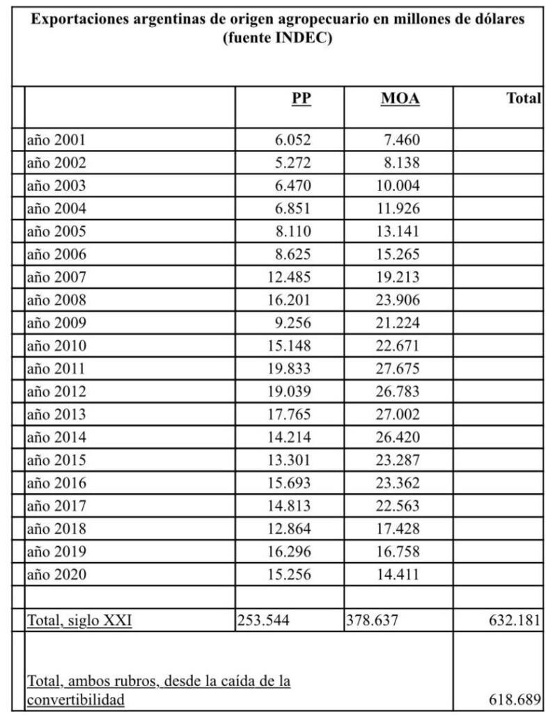 En base a datos oficiales, un análisis de la Confederación Intercooperativa Agropecuaria (Coninagro), señala que las exportaciones del sector agroindustrial treparon en dos décadas a u$s 632.181 millones, lo que es equivalente a dos veces y media el monto de las deuda pública total, nominada en dólares.