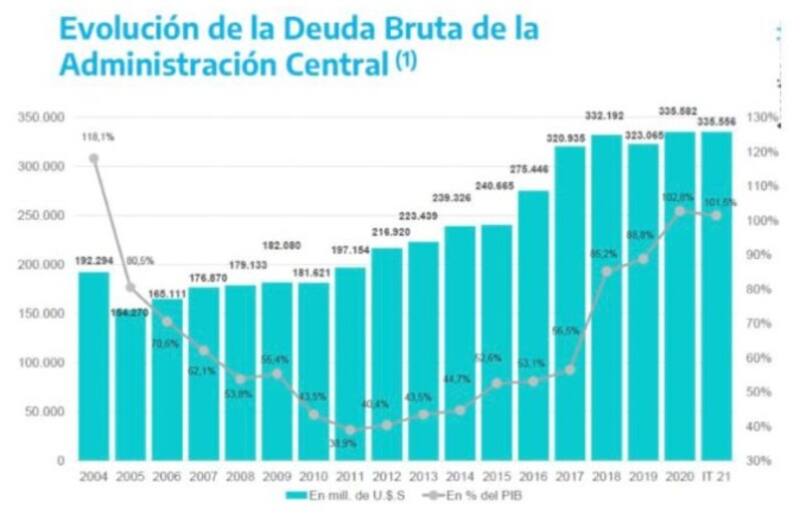 Y agrega que según datos oficiales, recabados por el Instituto Nacional de Estadística y Censos (Indec), la deuda externa bruta, a valor nominal, se sitúa en 258.378 millones de dólares. Es el 77% de la deuda total consolidada (335.556 millones de dólares), correspondiente a la parte nominada en moneda dura.