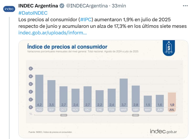 El ministro de Economía Luis Caputo destacó que el IPC que arrojó el Instituto Nacional de Estadística y Censos (Indec) se ubicó "por debajo del 2% mensual por tercer mes consecutivo. Esta dinámica no ocurría desde noviembre de 2017".