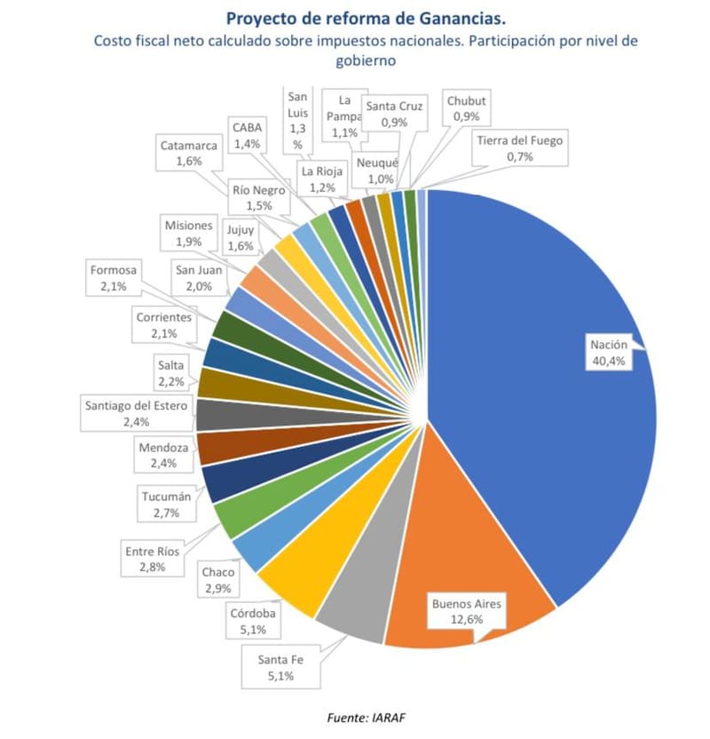 Si se analiza la distribución del costo fiscal entre los niveles de Gobierno: "el Sector Público Nacional financiará el 40% de la modificación, mientras que las provincias contribuirían con el 60% a través de los recursos netos resignados a través de la coparticipación, fruto de la reforma", aclaró Argañaraz.