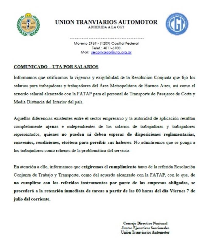 En un comunicado oficial, la UTA ratificó la vigencia y exigibilidad de la Resolución Conjunta que estableció los salarios para los trabajadores del Área Metropolitana de Buenos Aires, así como el acuerdo salarial alcanzado con la Federación Argentina de Trabajadores del Autotransporte de Pasajeros (FATAP) para el personal de Transporte de Pasajeros de Corta y Media Distancia del Interior del país.