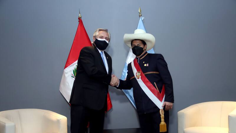 El presidente AlbertoFernández acompañó en Lima la jura e inicio del mandato del flamante mandatario del Perú, el docente y dirigente ruralista Pedro Castillo, quien prometió ejercer el cargo por los próximos cinco años con una agenda reformista y la voluntad de dejar atrás un período de grave inestabilidad institucional, tras la destitución de dos jefes de Estado (Pedro Pablo Kuczynski y Martín Vizcarra) y un gran tumulto social.