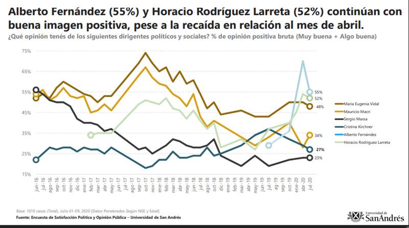 Pese a que la imagen de los principales dirigentes sigue modificándose, el dirigente con mayor imagen positiva continúa siendo el presidente Alberto Fernández (55%), seguido por Horacio Rodriguez Larreta (52%) y María Eugenia Vidal (48%). A estos le siguen Ricardo Alfonsin (43%) y Elisa Carrió (36%). Cabe mencionar que la imagen del presidente Fernández tuvo una caída de 15 puntos porcentuales respecto a la medición anterior. Por otro lado, tanto la imagen del actual gobernador de Buenos Aires, Axel Kicillof (32%) como de la vicepresidente Cristina Fernandez de Kirchner (27%) se mantienen en valores similares a la medición de abril.