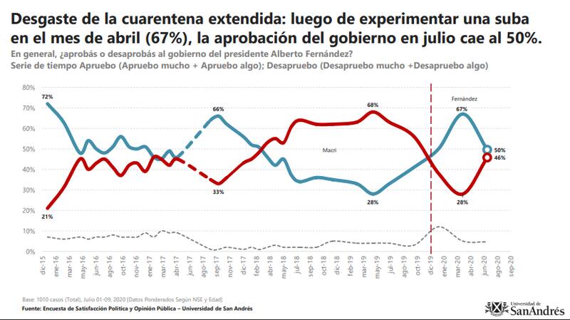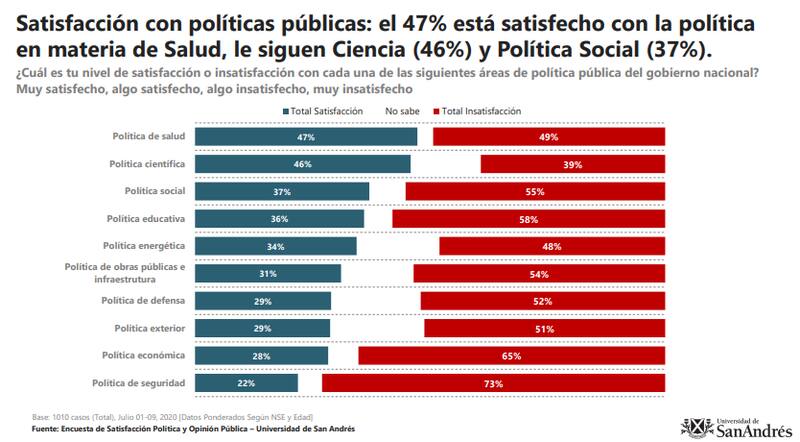 Como consecuencia del endurecimiento de la cuarentenaen la primera quincena de julio y el empeoramiento de la situación económica del país, cayó un 20% el porcentaje de satisfechos respecto a los niveles del mes de abril, según reveló una encuesta de la Universidad de San Andrés. Sin embargo, el informe detalla que la política de salud del Gobierno continúa siendo las más valoradas por los argentinos, al igual que la imagen positiva del presidente Alberto Fernández en comparación con el resto de los dirigentes tanto oficialistas como opositores.