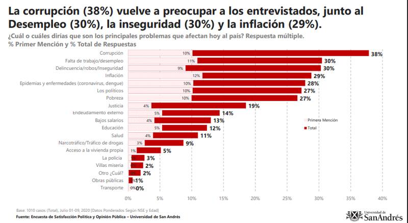 Entre los principales problemas que afectan hoy a la Argentina, los encuestados consideran que el principal problema es la Corrupción (38%), seguido por la Falta de empleo/desempleo (30%) y Delincuencia/robos/inseguridad (30%).