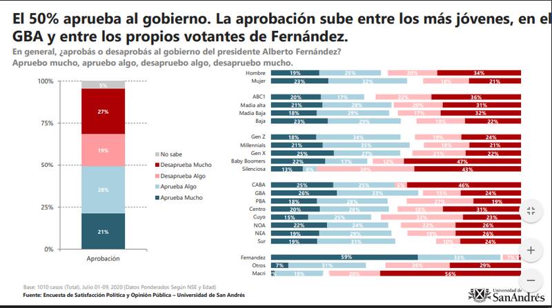 En lo que respecta a la aprobación de la gestión del Presidente, se puede observar que esta cayó respecto de las mediciones de abril, disminuyendo de 67% al 50% en el mes de julio. Gran Buenos Aires es la región con mayor aprobación. Entre los rangos etarios o generaciones, es notoria la diferencia entre los Millennials y la Generación Silenciosa: mientras que los primeros aprueban la gestión de Fernández en un 56%, los encuestados que forman parte de la generación Silenciosa desaprueban al gobierno en un 82%.