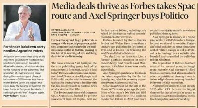 "La fiesta en cuarentena de Fernández desconcierta a los votantes argentinos", tituló FT en su portada y destacó en el texto: "Un escándalo por la fiesta sin barbijos en la residencia oficial del gobierno argentino puso más presión sobre el presidente Alberto Fernández, que ya estaba en la mira por su administración de la pandemia".