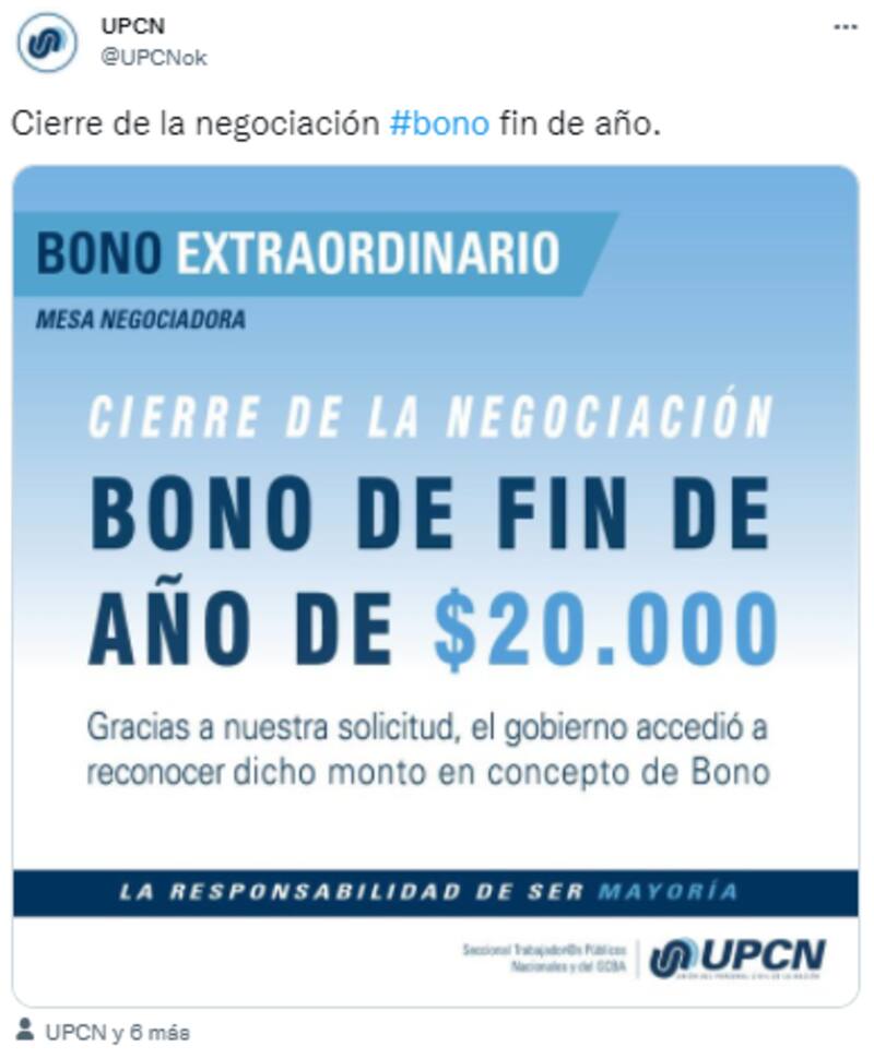 "Cierre de negociación: bono de fin de año de $ 20.000. Gracias a nuestra solicitud, el Gobierno accedió a reconocer dicho monto en concepto de bono", anticipó la Unión del Personal Civil de la Nación (UPCN) en redes sociales.