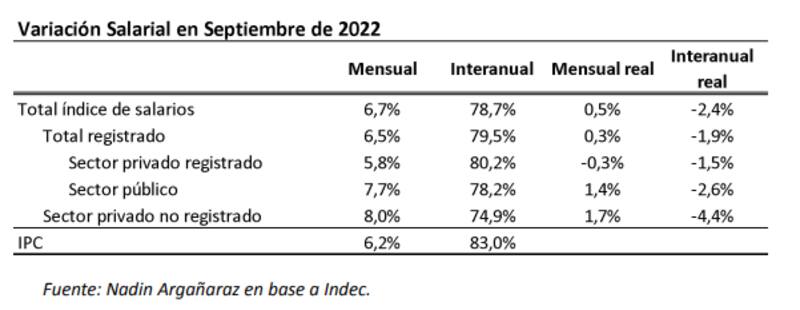 De acuerdo al informe de "Coyuntura macro" elaborado por el titular del Instituto Argentino de Análisis Fiscal (IARAF), Nadin Argañaraz, a septiembre 2022, los trabajadores privados formales perdieron el equivalente a 1,5 sueldos de 2017, los trabajadores públicos 1,9 sueldos y los informales a 3 sueldos.