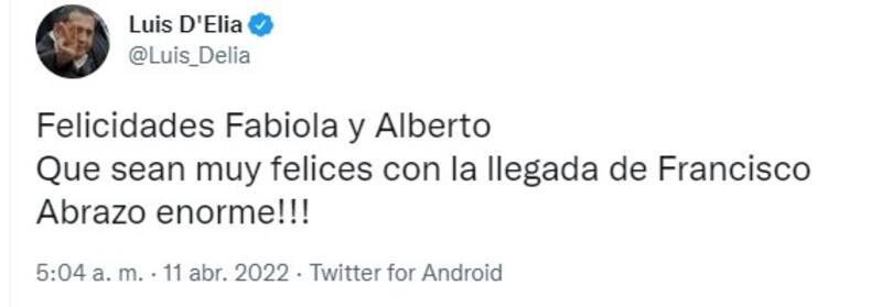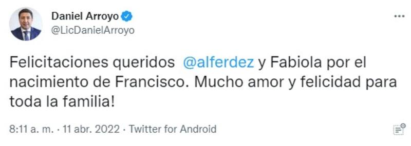 "Felicitaciones queridos Alberto y Fabiola por el nacimiento de Francisco. ¡Mucho amor y felicidad para toda la familia!", publicó el diputado y exministro de Desarrollo Social Daniel Arroyo, en tanto el ministro de Defensa, Jorge Taiana, le dio la "bienvenida" a Francisco.