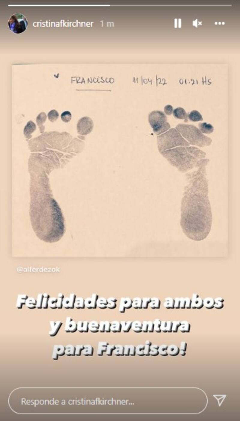 En medio de las internas en el oficialismo, el saludo de la vicepresidenta Cristina Kirchner llegó pasadas las 11 de la mañana a las redes sociales. "Felicidades para ambos y buenaventura para Francisco", escribió en una historia en su cuenta de Instagram. Según trascendió, la vicepresidenta también envió un ramo de flores al sanatario Otamendi con esa misma dedicatoria.