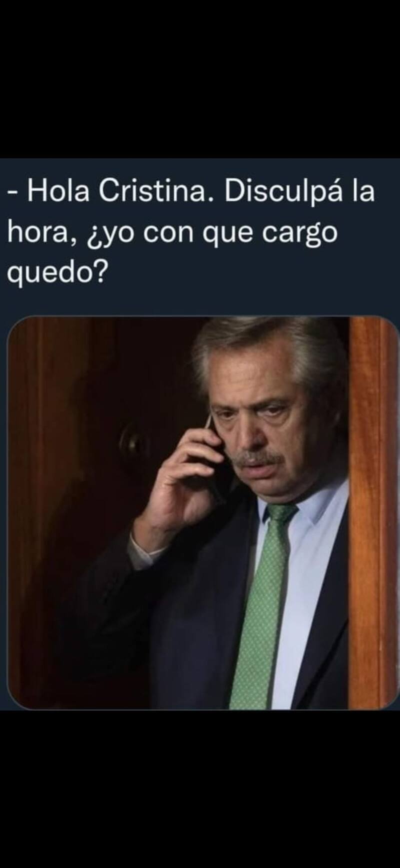 Fue el meme que más clickeos recogió en las redes en las últimas horas. Alberto Fernández al teléfono dice: "Hola Cristina, perdoná la hora: ¿Yo con qué cargo me quedo?" La imagen no cayó nada bien en la Casa Rosada. Pero el sarcasmo ilustra una cruda realidad: la de un Presidente acorralado, debilitado, sin planes para su reelección 2023 y con toda la suerte de su gobierno atada al designio de Sergio Massa o a los malhumores de la Vicepresidenta.
