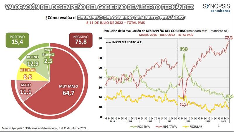 Ante la consulta "cómo evalúa el desempeño del gobierno de Alberto Fernández", la respuesta predominante fue "muy mala", con el 64,7%, que se le añade al 11,1% de "mala" y redondea un global de 75,8%, récord desde que asumió la presidencia.