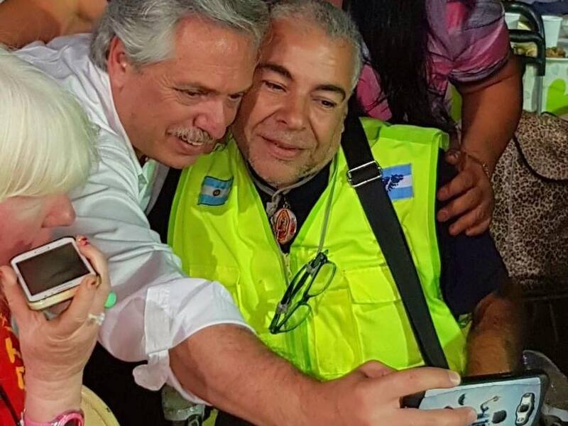 En las imágenes se lo ve a Fernández rodeado de fieles e incluso accediendo a tomarse selfies con los más entusiastas.