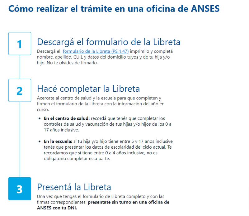 Año a año, las beneficiarias deberán presentar el documento de manera presencial y sin turno en una oficina de la ANSES. Para realizar el trámite, deberá seguir los siguientes pasos: