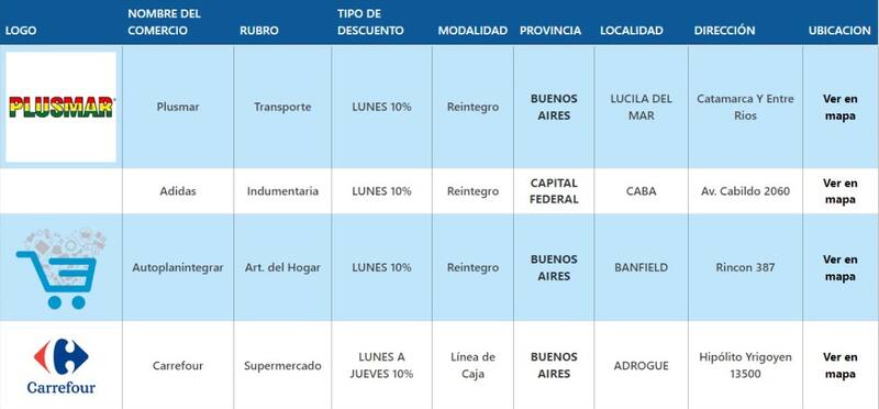 Allí se encontrarán con un cuadro extenso que indica el rubro, el tipo de descuento, la ubicación y la modalidad.