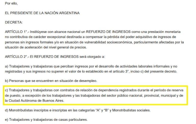 "El Refuerzo de Ingresos será otorgado a trabajadores y trabajadoras con contratos de relación de dependencia registrados durante el período de reserva de puesto, a excepción de los trabajadores y las trabajadoras del sector público nacional, provincial, municipal y de la Ciudad Autónoma de Buenos Aires", apunta el artículo 2° del Decreto 216 publicado en el Boletín Oficial.