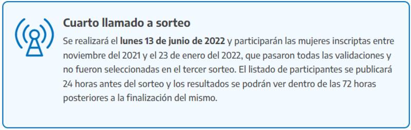 "Se realizará el lunes 13 de junio de 2022 y participarán las mujeres inscriptas entre noviembre del 2021 y el 23 de enero del 2022, que pasaron todas las validaciones y no fueron seleccionadas en el tercer sorteo", anunció la cartera conducida por Juan Zabaleta.