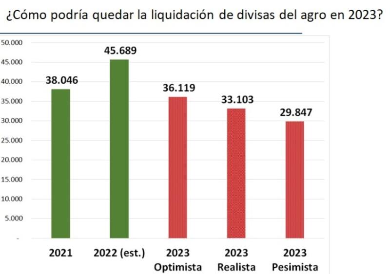 En este contexto el ingreso de dólares bajaría a u$s 33.103 millones en 2023, lo que refleja un 27,5% o u$s 12.586 millones menos.