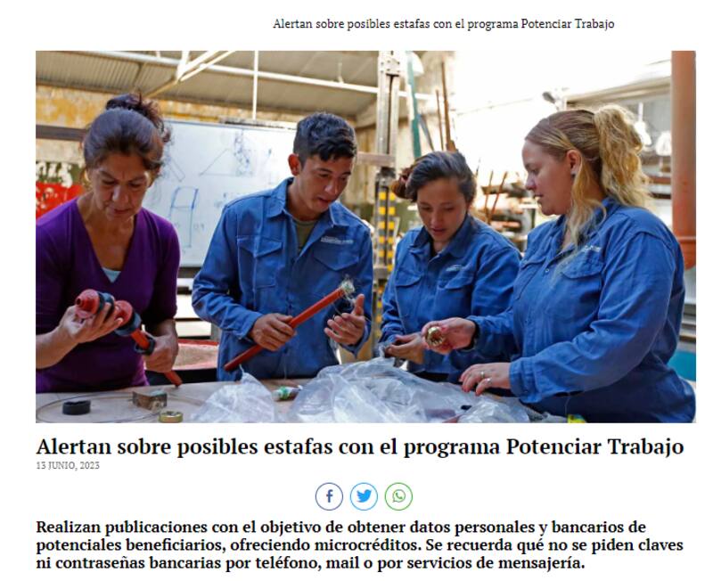 El Ministerio de Desarrollo Social de la Nación alertó por la circulación de publicaciones falsas apuntadas tanto a beneficiarios del programa Potenciar Trabajo como a las y los aspirantes mediante el ofrecimiento de créditos no bancarios.