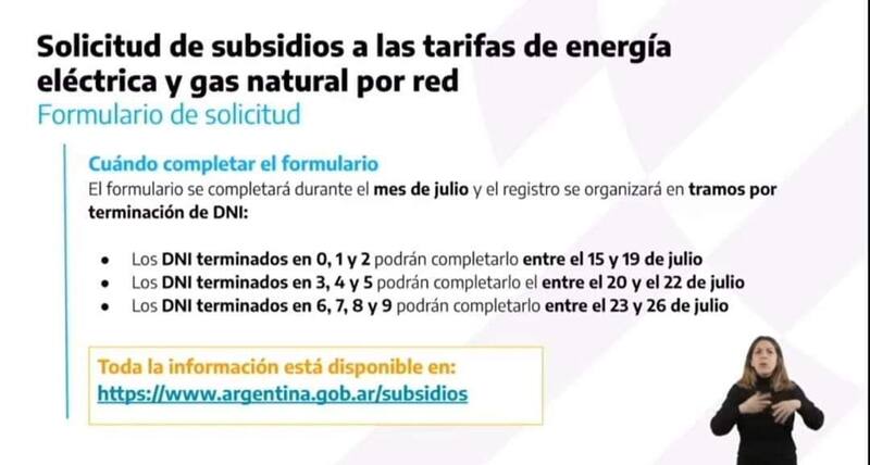 Finalmente, desde el sábado 23 hasta el martes 26, podrán completar la planilla para el mantenimiento de subsidios de luz y gas, los usuarios con DNI terminados en 6, 7, 8 y 9.