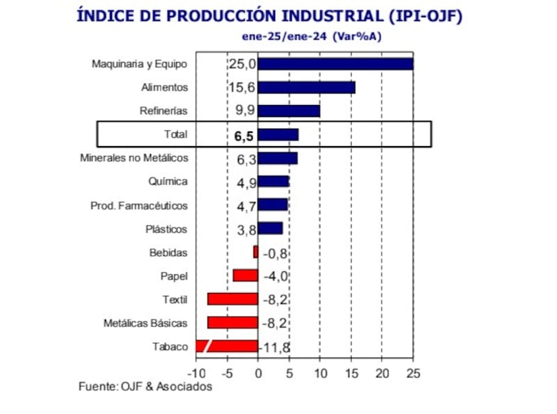 La producción industrial experimentó un crecimiento interanual del 6,5% en enero de 2025, según el Índice de Producción Industrial (IPI-OJF) de la consultora de Orlando Ferreres, que también arrojó un dato negativo para el Gobierno.