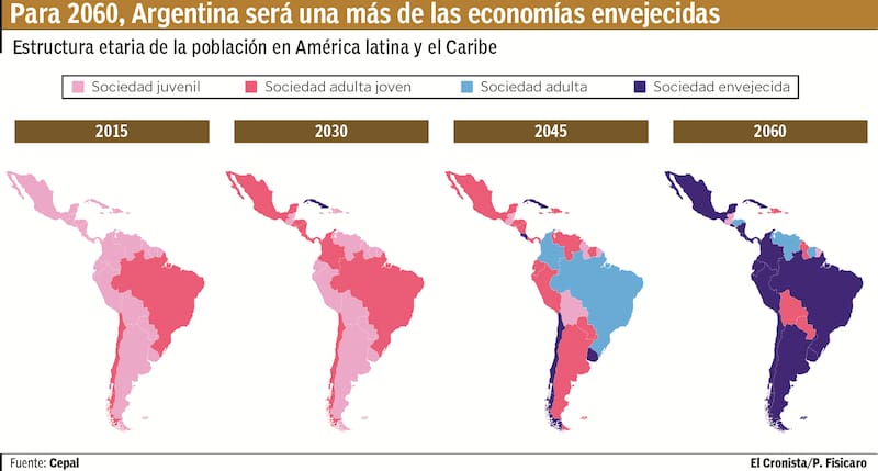 Hoy Argentina es uno de los países que tienen tasas de fecundidad sobre el nivel de reemplazo, pero con esperanzas de vida superiores a la media regional. Para 2060, será una más de las economías envejecidas.