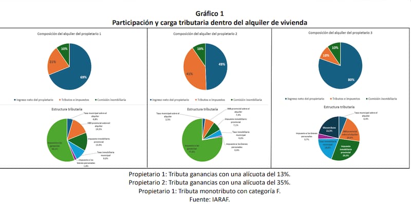 Según IARAF, en el primer caso la carga tributaria total —sumando impuestos nacionales, provinciales y municipales— representa el 20,8% del valor del alquiler. En el segundo, el peso impositivo se eleva al 40,6%, principalmente por el impacto del impuesto a las ganancias. En el caso del monotributista, la carga tributaria se reduce al 10% de los ingresos.