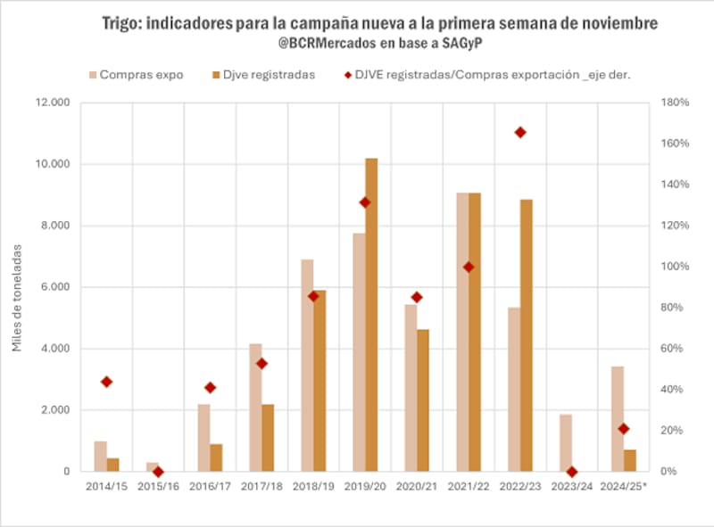 Así, la nueva cosecha rompió el ritmo de ingreso promedio del último mes de 450 camiones semanales, que se ha transformado en el ritmo diario de ingresos. "Ya habiendo culminado la primera semana de noviembre, el trigo del norte comienza a copar el mercado local y en varias delegaciones oficiales la cosecha 2024/25 ya supera el 50% del área objetivo", destacó el informe de la BCR.